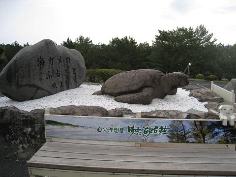 写真2.海がめの後ろの石碑には、海がめのふるさと吹上浜と書いてあったような