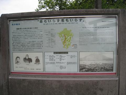 写真1・南州墓地の看板には「命もいらず、名もいらず」という西郷隆盛の言葉がかいてあります。命も名もいらぬ人はどうしていいかわかりませんね。こんなに強い人はいないでしょう。